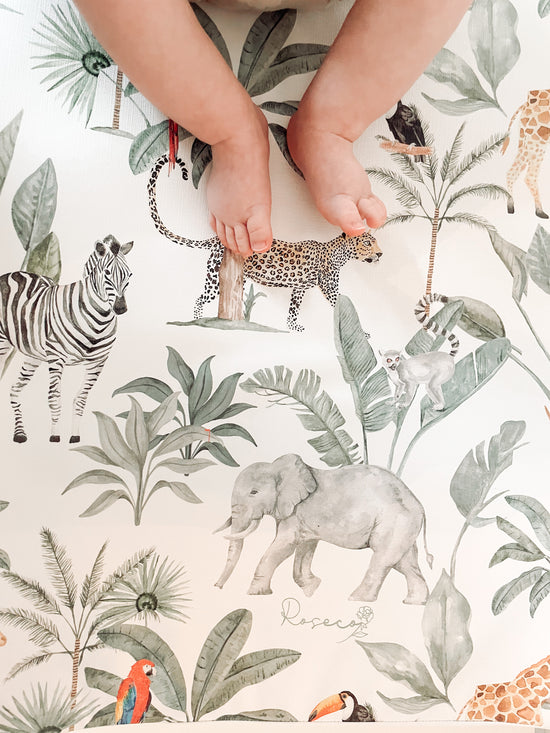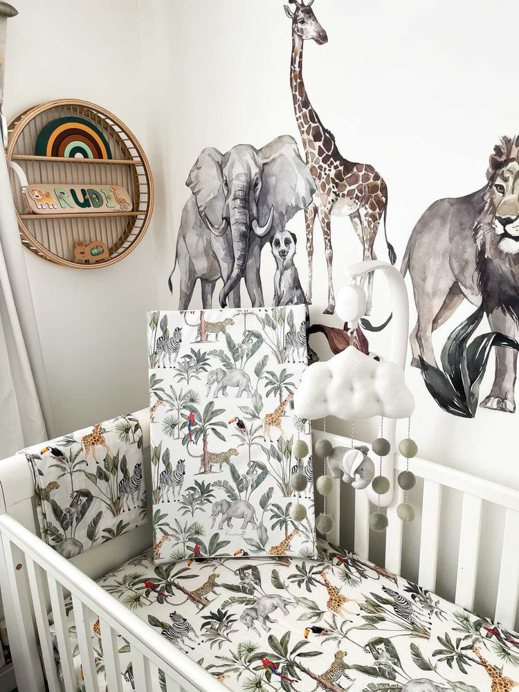 Shop our range of nursery decor in our beautiful safari design available in matching items including fitted organic cotton cot bed sheets, muslin swaddle, anti roll changing mat, changing mat and travel mat! Our organic cot bed sheets have been made with love care & attention to be soft and gentle on your babies perfect skin, ensuring a comfortable place to rest whilst they enjoy the sweetest of dreams!