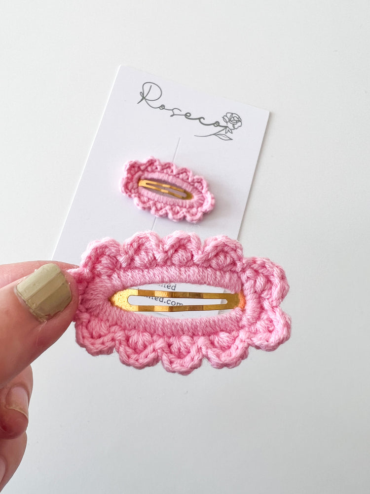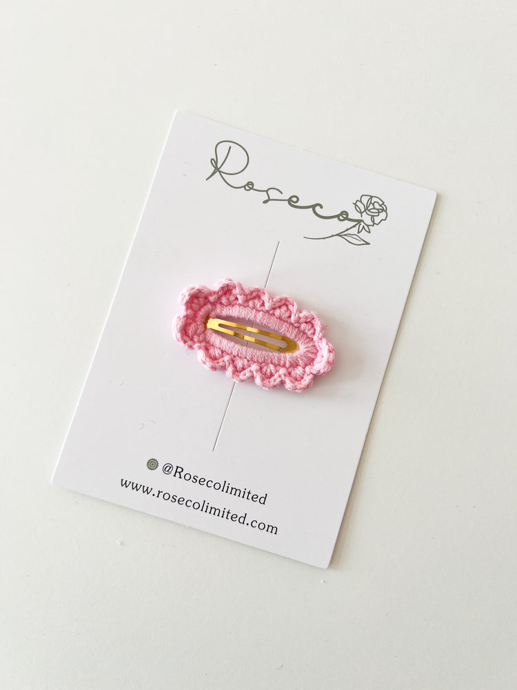 Our beautiful intense pink crochet snap clip is sold individually and is perfect for clipping back little fringes and can be added to any hairstyle.