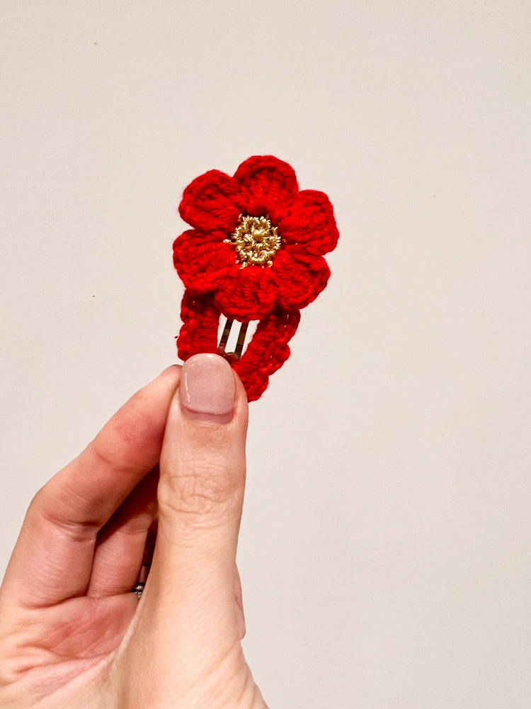Our beautiful pink flower crochet snap clip is sold individually and is perfect for clipping back little fringes and can be added to any hairstyle. The beautiful red crochet clip & flower with a gold centre has been added to a soft back snap clip.