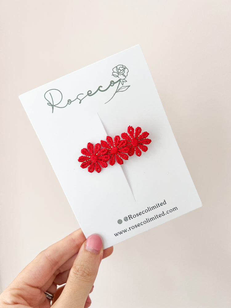 Our red knitted trio flower clip is sold individually and can be added to any hairstyle. Each clip is made up of a trio of flowers attached to an alligator clip.
