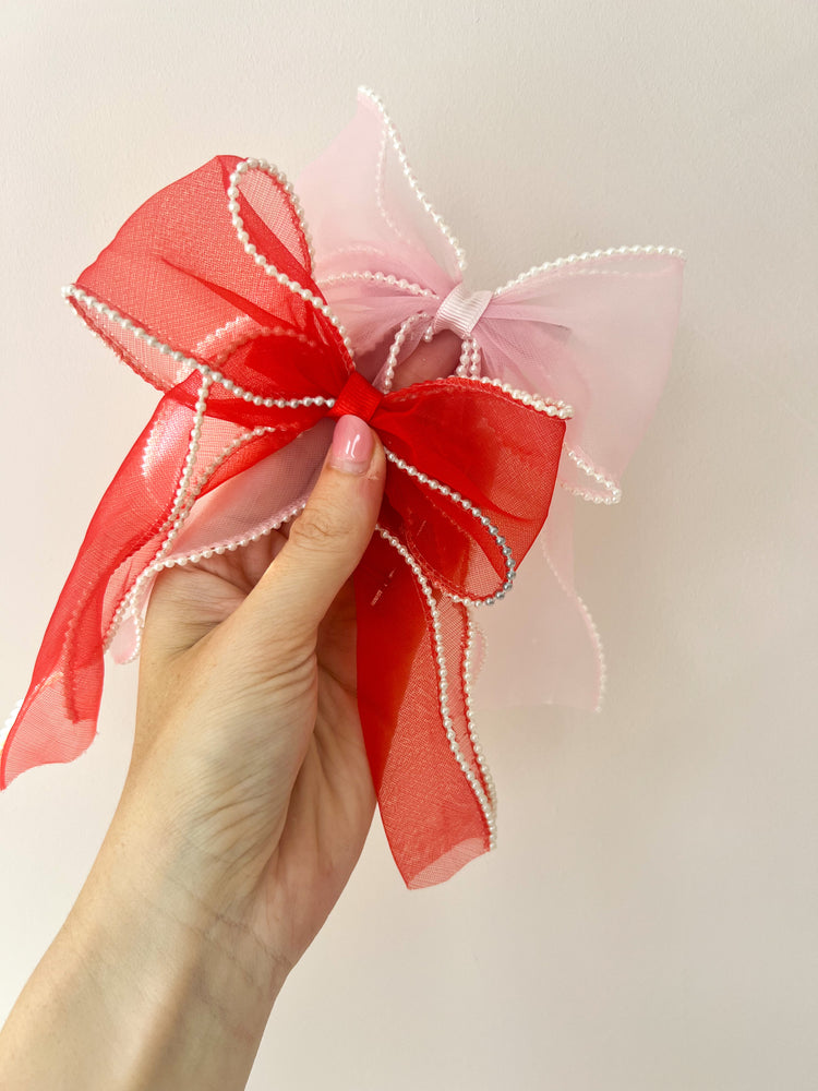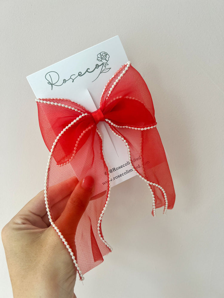 Our beautiful red pearl large  bow is the perfect addition for your little ones hairstyle! Each bow is approximately 10cm long and is large size! It is perfect for adding some Christmas sparkle to your little ones outfit!