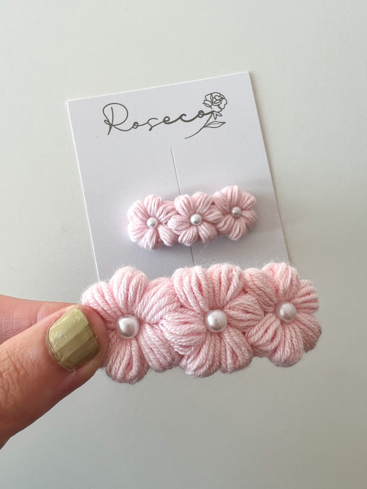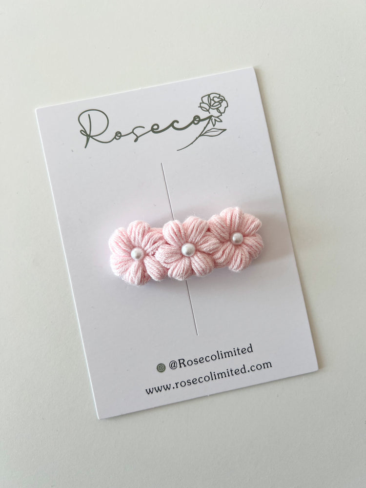 Our beautiful yarn wool trio flower hair clips are perfect for clipping back little fringes and look lovely in your little ones hair adding that something special to any hair stlyle! Each flower has a lovely pearl in the centre too!