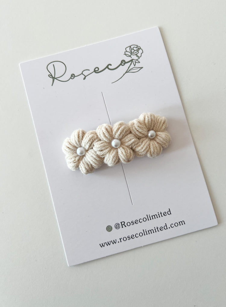 Our beautiful yarn wool trio flower hair clips are perfect for clipping back little fringes and look lovely in your little ones hair adding that something special to any hair stlyle! Each flower has a lovely pearl in the centre too!