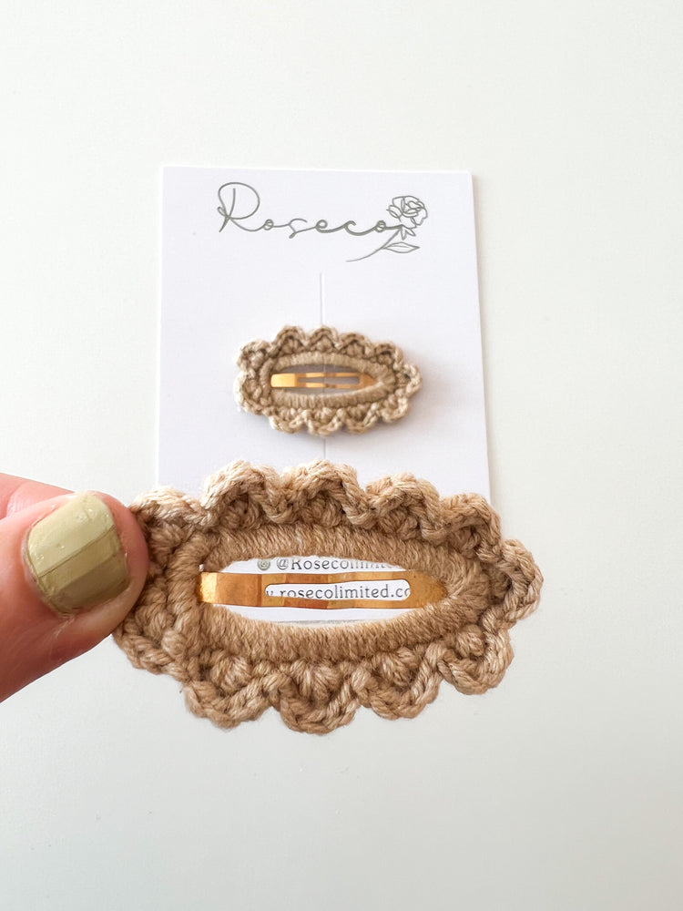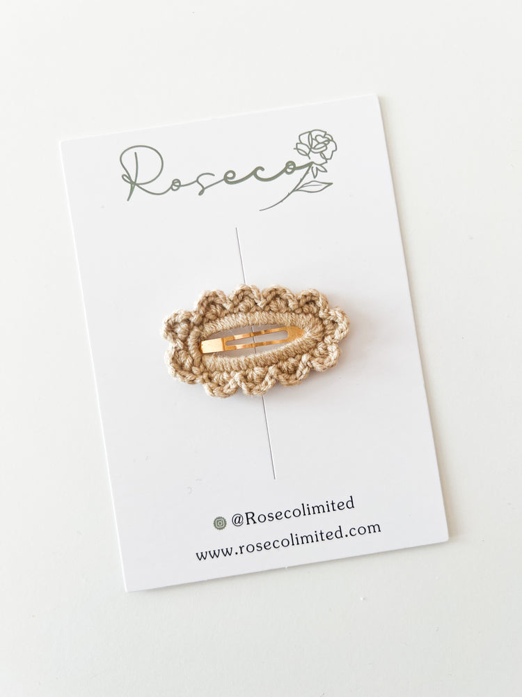 Our beautiful caramel crochet clip is sold individually and is perfect for clipping back little fringes and can be added to any hairstyle.