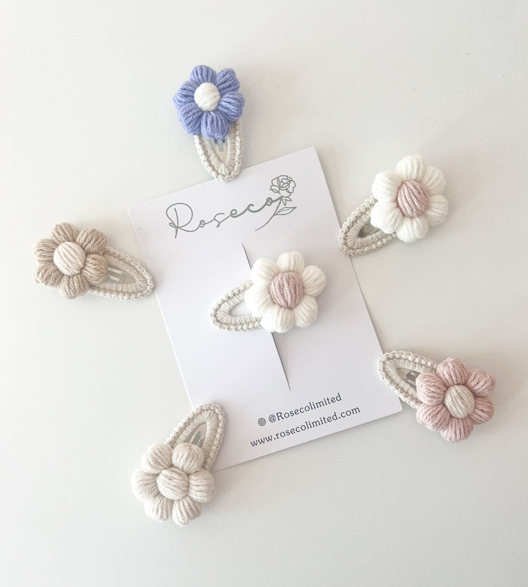 Our beautiful caramel puff flower crochet clip is sold individually and is perfect for clipping back little fringes and can be added to any hairstyle. The beautiful crochet clip has a beige & brown puff flower attached to the end has been added to a snap clip.