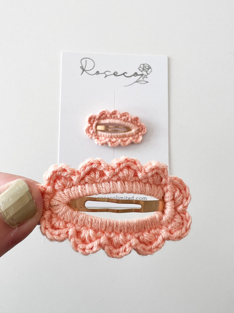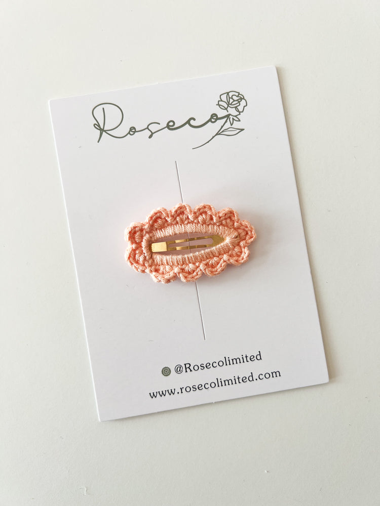 Our beautiful coral crochet clip is sold individually and is perfect for clipping back little fringes and can be added to any hairstyle.