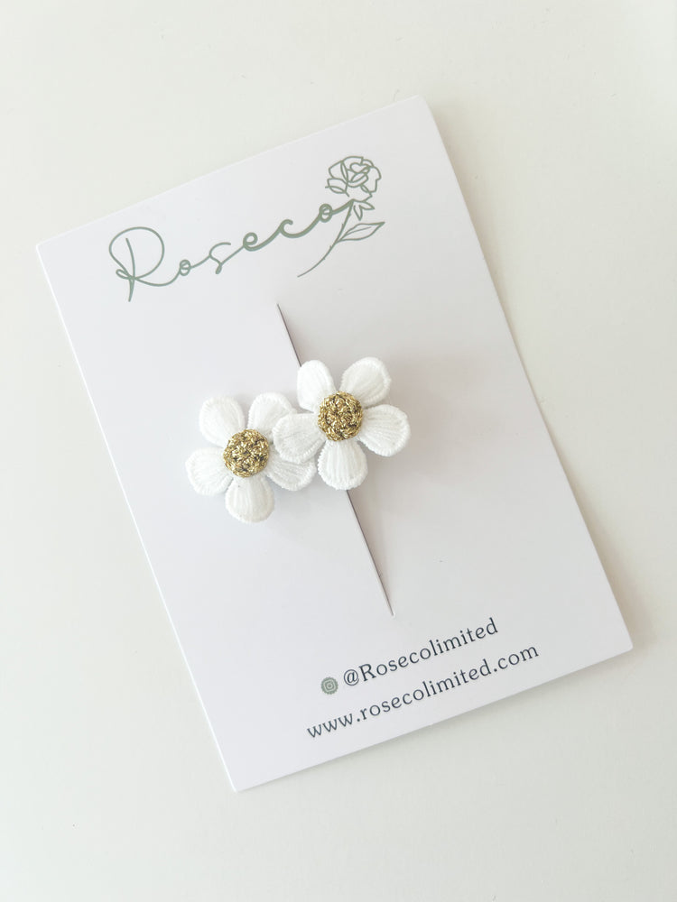 Our beautiful duo white clip is sold individually and is perfect for clipping back little fringes and can be added to any hairstyle. The beautiful white flower with a gold middle have been added to a soft back clip.