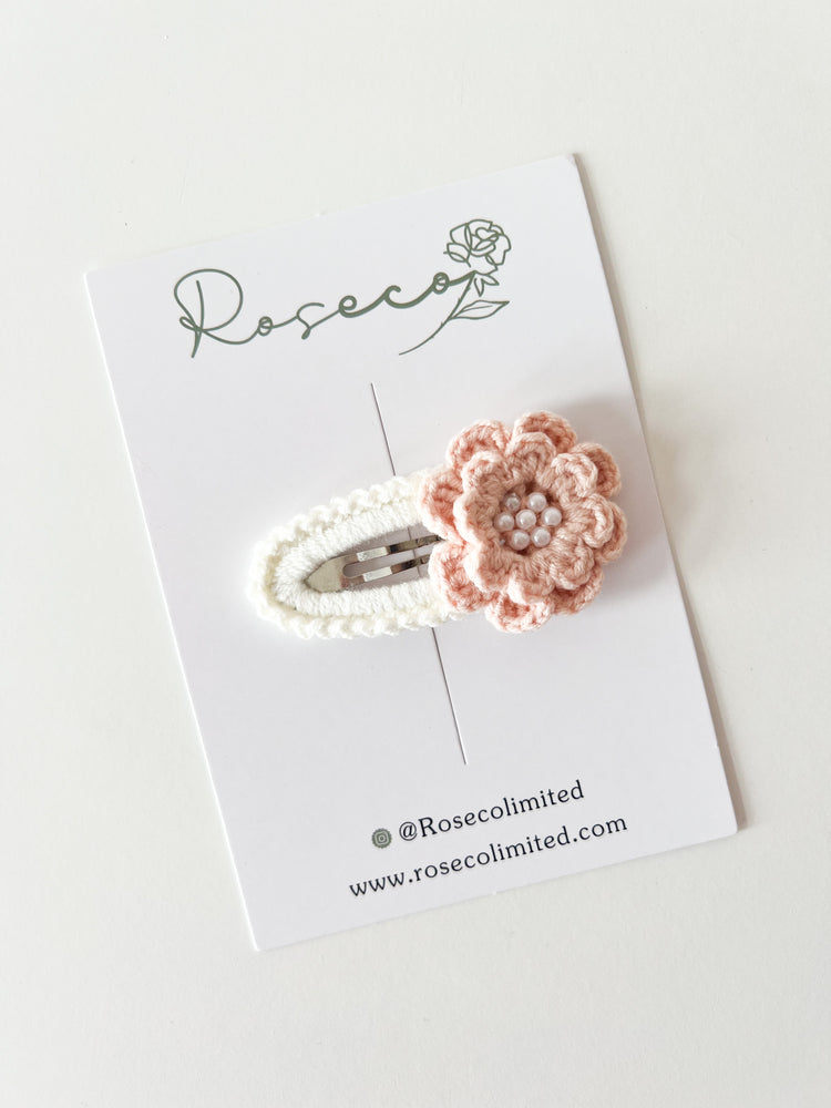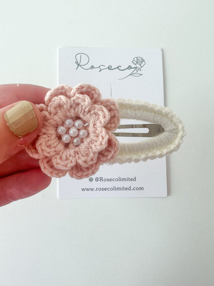 Our beautiful pink pearl flower crochet clip is sold individually and is perfect for clipping back little fringes and can be added to any hairstyle. Each crochet clip has a flower with a pearl middle attached to the end of the snap clip.