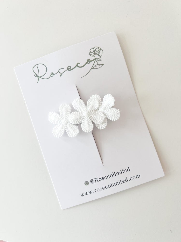 Our beautiful Victoria floral clip is sold individually and can be added to any hairstyle. The 3 large beautiful white flowers have been added to a softback clip.