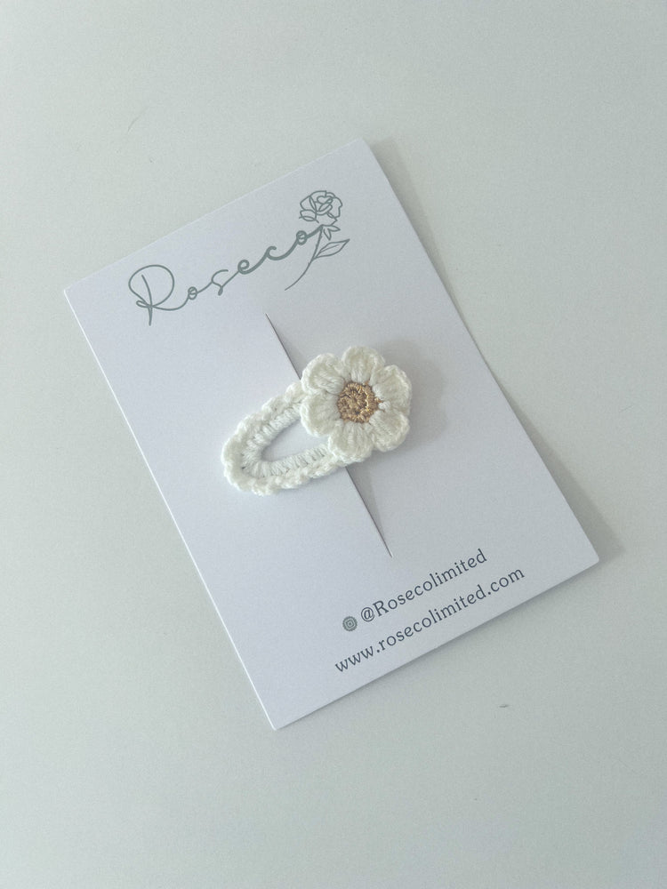 Our beautiful white flower crochet snap clip is sold individually and is perfect for clipping back little fringes and can be added to any hairstyle. The beautiful white crochet clip & flower with a gold centre has been added to a soft back snap clip.