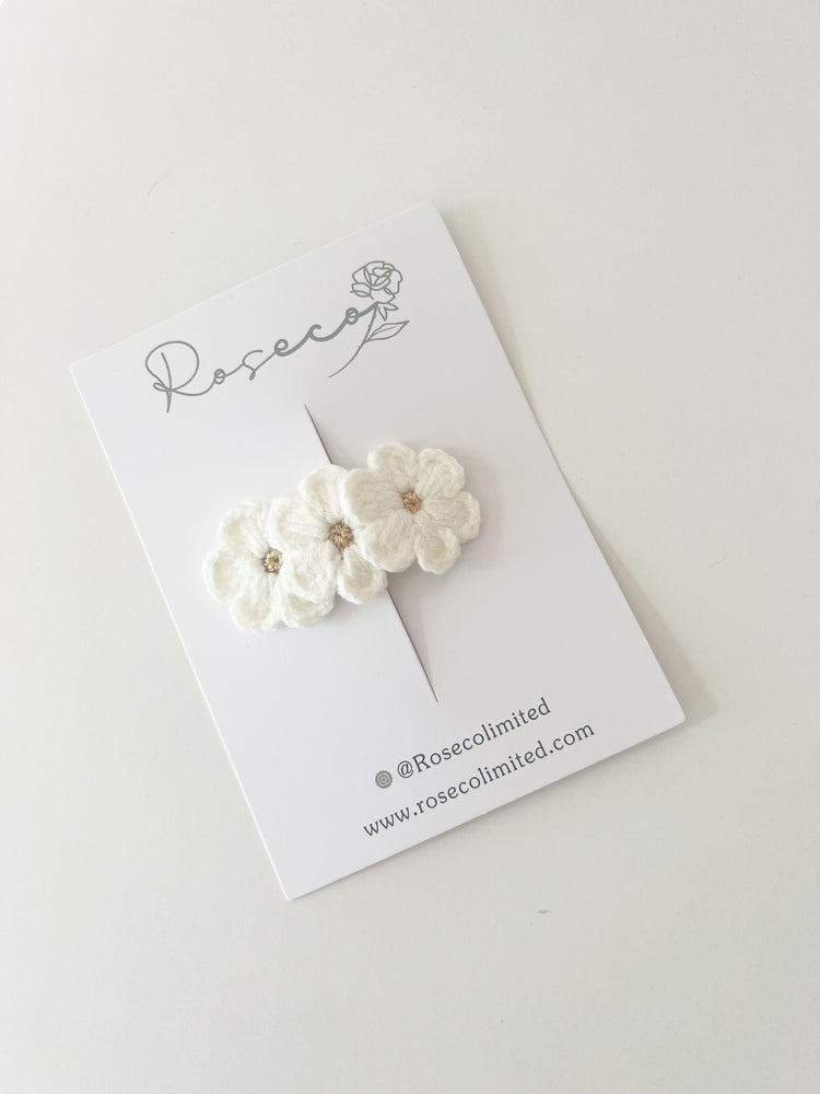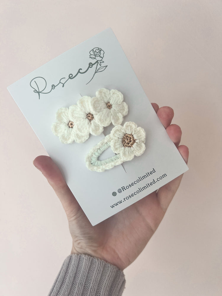Our beautiful trio flower crochet clip  in white with gold centres is sold individually and can be added to any hairstyle.