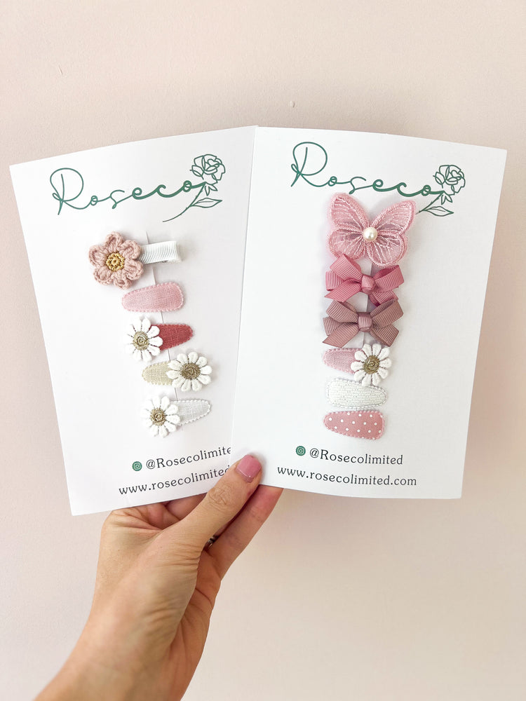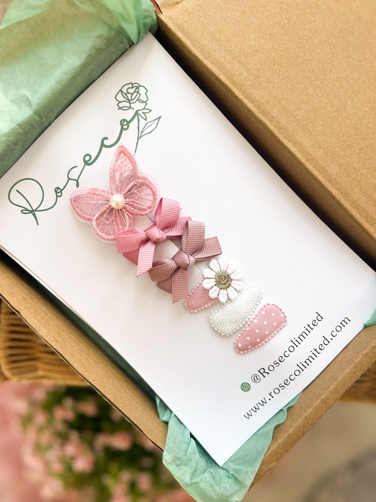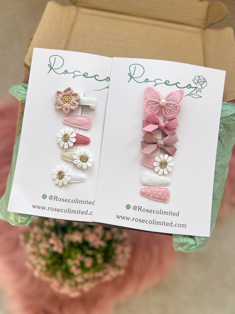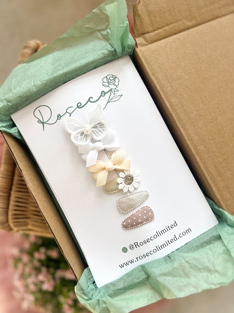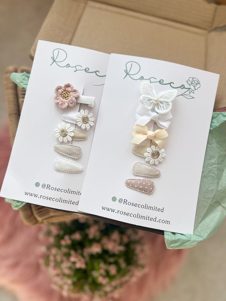 The sets are available in two colours- pink and beiges/whites. They can also be purchased as the whole set (11 clips in total) or as the set of 6 clips (the butterfly card) both will be packaged & wrapped in tissue paper! If you would like this packaged in a Kraft box with a birthday stamp please leave a note on the order and we can do this for you and add a gift not If required!