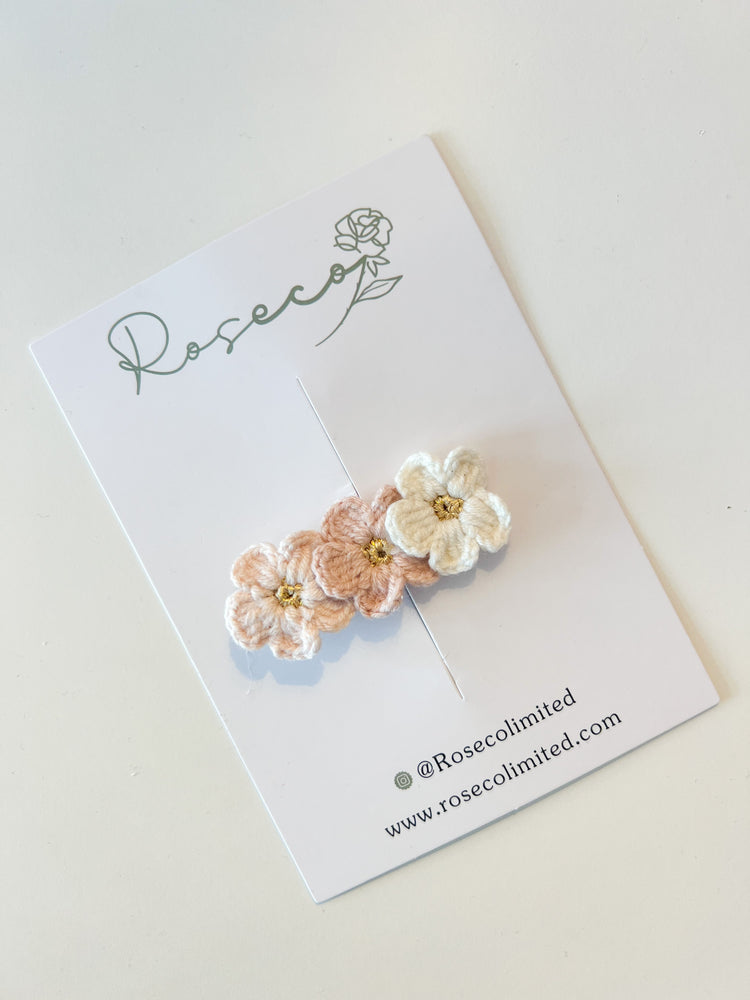 Our beautiful trio flower crochet clip  in white, pale pink & dusky pink is sold individually and can be added to any hairstyle.