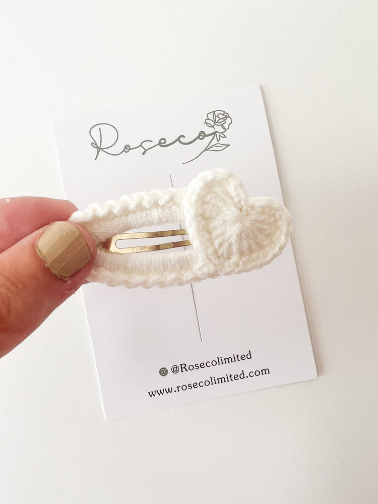 Our beautiful white heart crochet clip is sold individually and is perfect for clipping back little fringes and can be added to any hairstyle. The beautiful white crochet snap clip has a white heart added to the end.