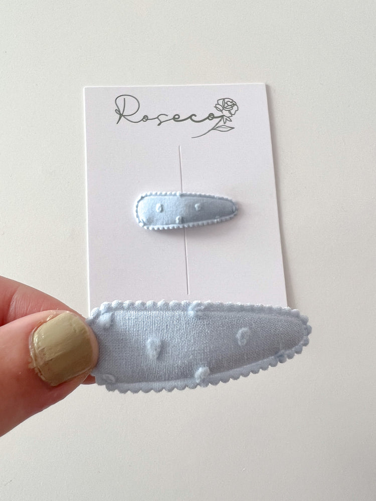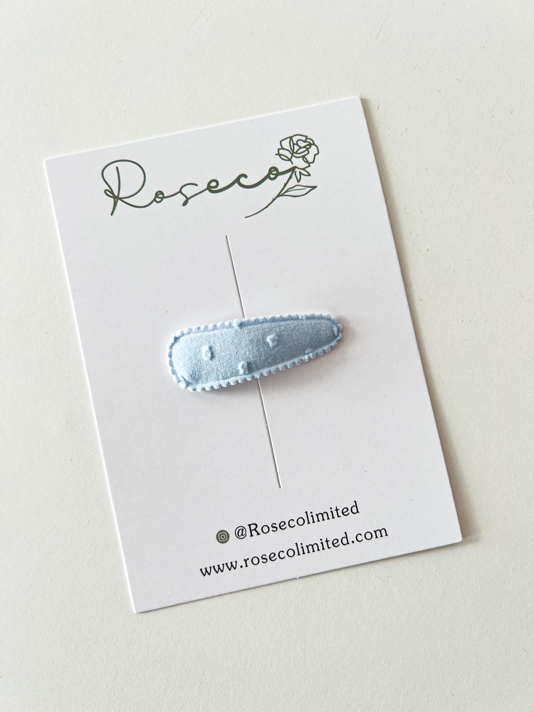 Our beautiful blue dotty snap clip is sold individually and is perfect for clipping back little fringes and can be added to any hairstyle.