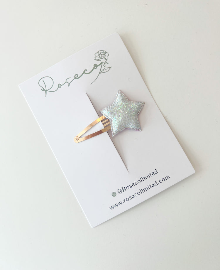 Our beautiful glitter star hairlip is available in 4 different colours and is perfect for clipping back little fringes and adding something special to their hairstyle!