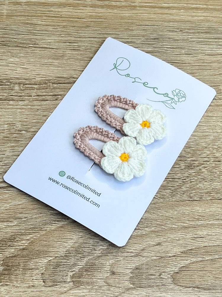 Our beautiful dusky pink flower crochet snap clip is sold individually and is perfect for clipping back little fringes and can be added to any hairstyle. The beautiful dusky pink crochet clip & white flower has been added to a snap clip.