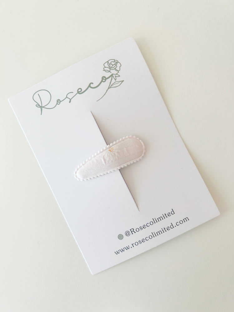 Our beautiful light pink daisy snap clip is sold individually and is perfect for clipping back little fringes and can be added to any hairstyle.