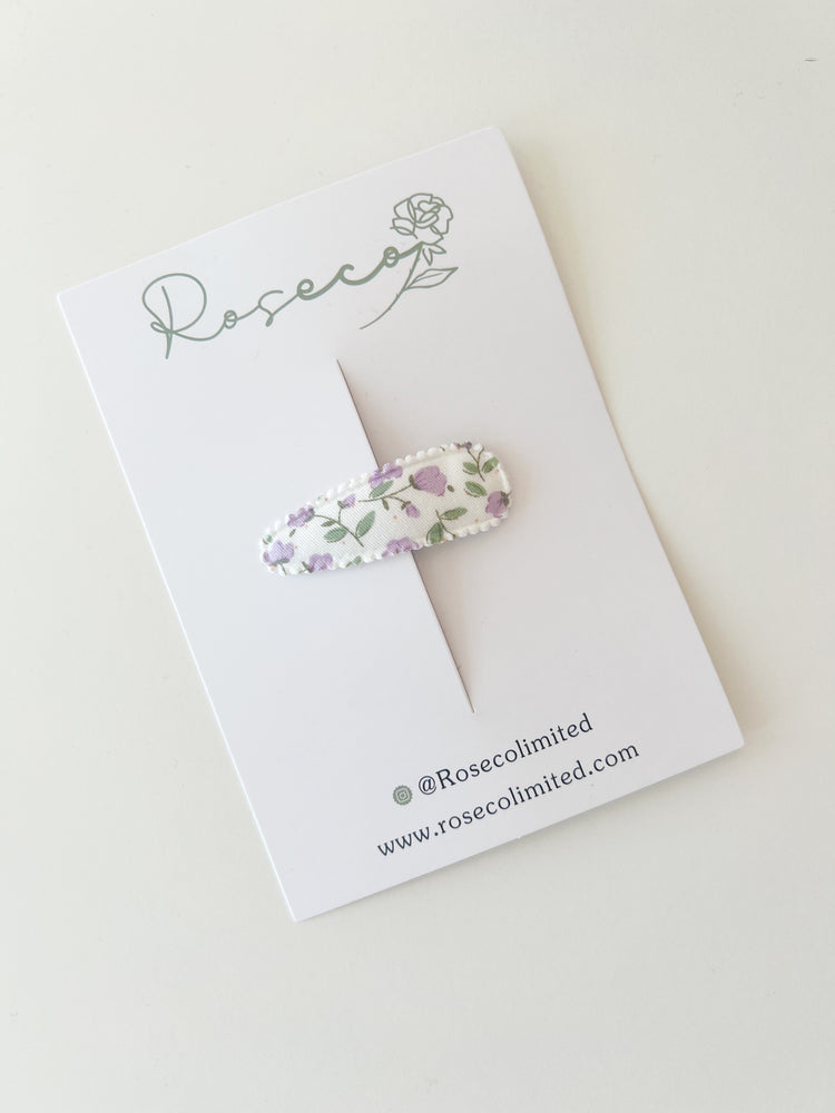 Our beautiful Lilac Bloom snap clip is sold individually and is perfect for clipping back little fringes and can be added to any hairstyle.