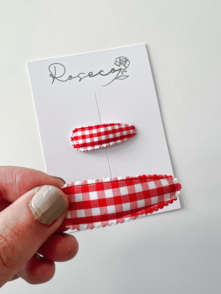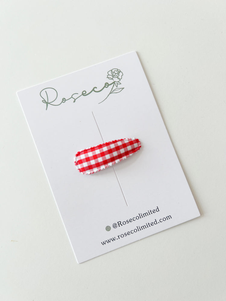 Our beautiful red gingham snap clip is sold individually and is perfect for clipping back little fringes and can be added to any hairstyle.