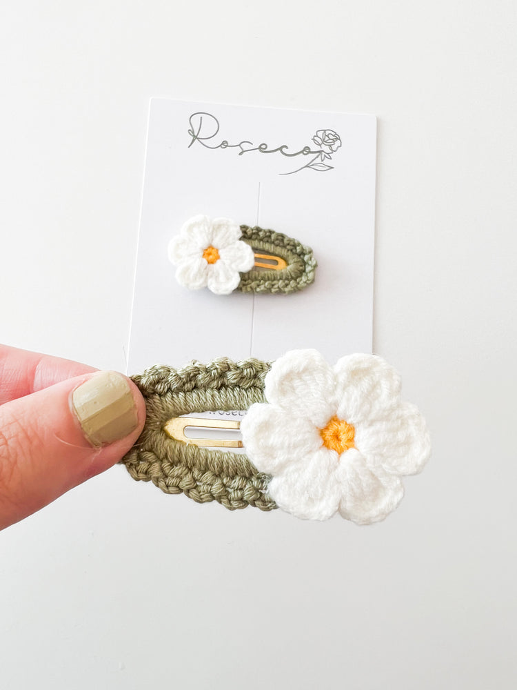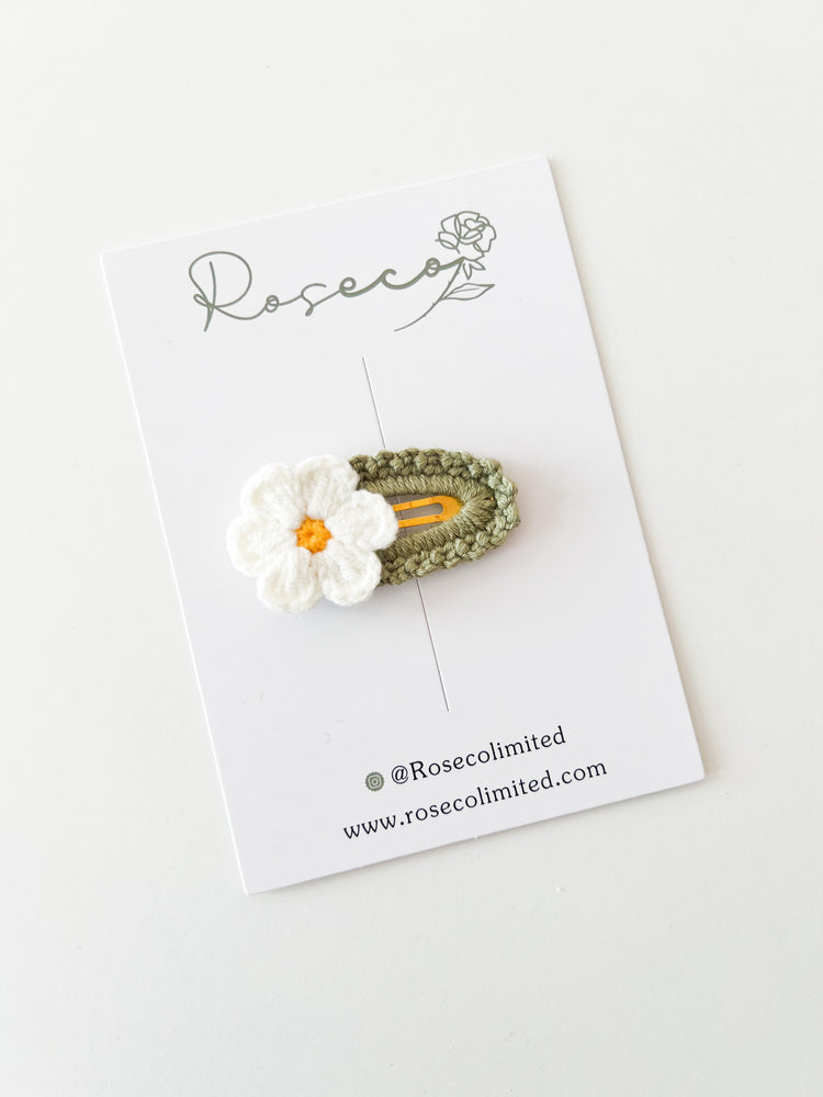 Our beautiful sage green flower crochet snap clip is sold individually and is perfect for clipping back little fringes and can be added to any hairstyle. The beautiful sage green crochet clip & white flower has been added to a snap clip.