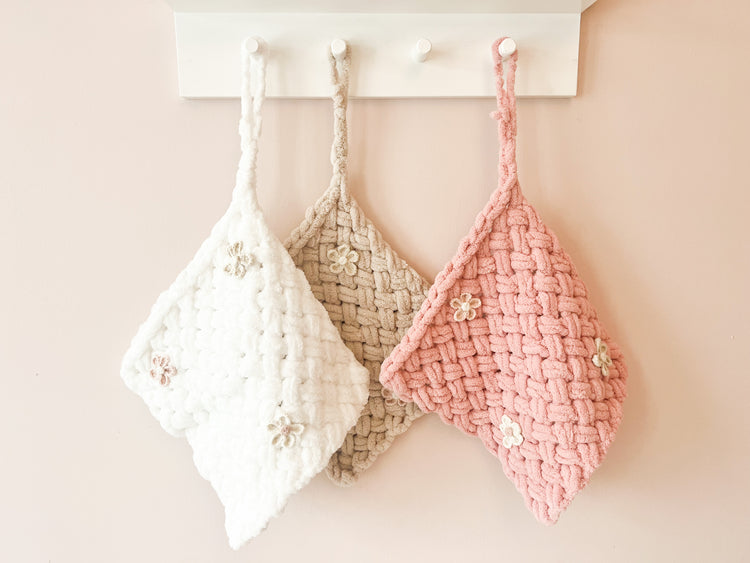 Our beautiful soft baby comforter for your little one! Our comforters are soft and breathable and are available in a number of colours and with additional flowers added! Each comforter has a loop attached to a corner to allow you to add a wooden teether or a dummy. The loop can be removed, but the end will need to be knotted several times to ensure the comforter does not come undone.